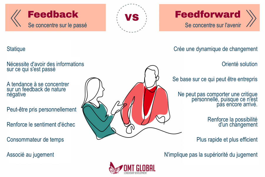 - Le feedforward donne un aperçu constructif des compétences ou des comportements nécessaires pour atteindre un objectif. L'accent est mis sur le changement et l'amélioration. Le feedback décrit généralement ce qu'une personne a fait ou n'a pas fait, mais il manque d'informations concrètes sur ce que la personne pourrait faire pour changer et s'améliorer.