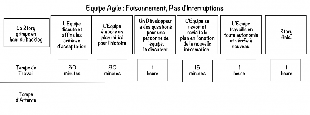Faites la comparaison avec une équipe (Agile ou non) qui fonctionne correctement. Cette équipe consacrera davantage de temps à travailler qu'à attendre. J'ai parlé de foisonnement dans l'exemple, parce que les équipes n'ont pas besoin d'être Agile pour foisonner. Voici l'exemple d'une chaîne de valeur pour une équipe Agile qui a l'habitude de foisonner :